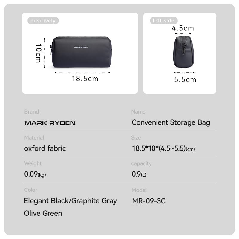 The Mark Ryden Model 09 handbag is designed for those who value simplicity and practicality. Crafted from high-quality Oxford fabric, this bag is not only durable but also waterproof, providing an extra layer of protection for your belongings. Its minimalist design is highlighted by large pockets, ensuring that everything you need is within easy reach. Despite its compact size of 18.5 x 10 x (4.5 ~ 5.5) cm, the bag is surprisingly spacious, with a capacity of 0.9 liters, making it perfect for carrying your daily essentials.