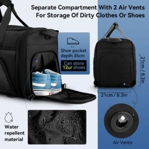 This multifunctional bag is perfect for a 2-3 day itinerary, with high capacity and well-organized storage. It includes a dedicated shoe pocket with two air vents for ventilation, helping to keep your gear fresh. The water-repellent fabric ensures your belongings stay dry during rainy conditions.
