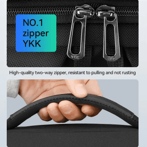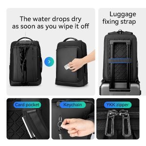 The backpack also includes a luggage fixing strap, allowing it to be securely attached to your suitcase for easy transport during travel. Additional features include a card pocket, keychain, and YKK high-quality two-way zippers, which are resistant to pulling and rusting, ensuring long-lasting use.