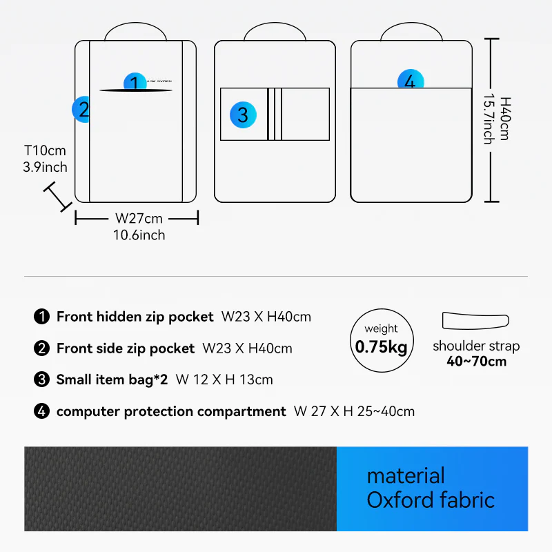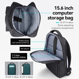 The backpack features a dedicated 15.6-inch laptop compartment (W27 x H40 cm) with shock-absorbing protective layers, ensuring your device is safe and secure. Multiple shock-absorbing compartments throughout the bag provide added protection for your belongings, giving you peace of mind during your travels. The YKK®️ brand zippers, known for their durability and smooth operation, are complemented by a double zipper design that allows for padlock security.