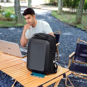 The backpack features a TSA anti-theft lock on the exterior for added security, as well as a back anti-theft pocket to keep valuables like wallets and phones safe. It includes dedicated compartments for a 15-inch laptop and a 12.9-inch tablet, ensuring your tech gear is well-protected. A waterproof pocket is included for storing toiletries or wet items.