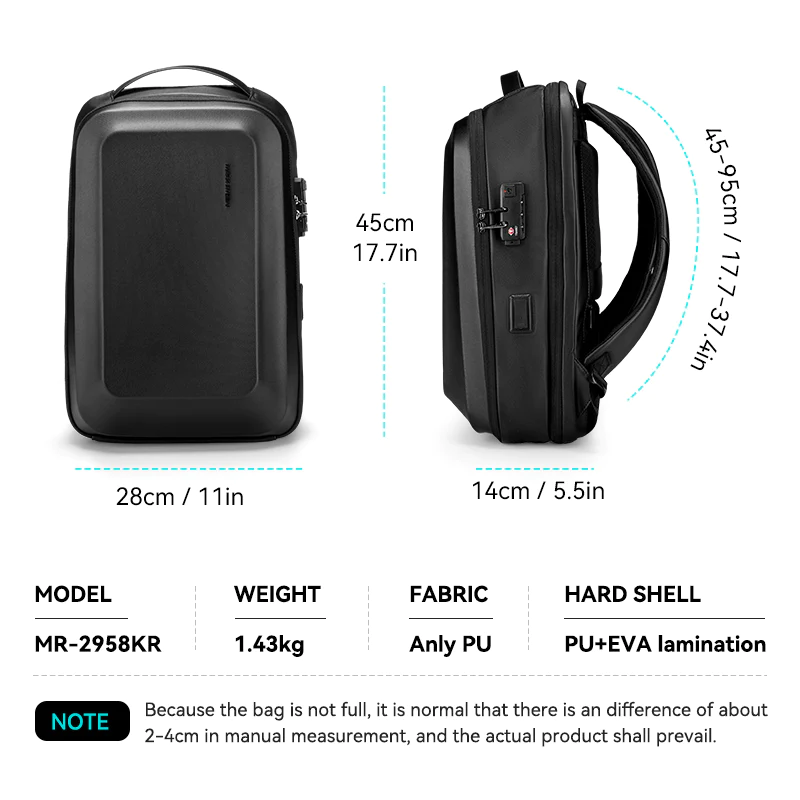 The Mark Ryden Model 2958 Anti-Theft Backpack is a sleek and functional choice for modern travelers. With its hard shell constructed from PU and EVA lamination, the backpack offers excellent durability and a sophisticated look. Measuring 45 x 28 x 14 cm and weighing 1.43 kg, it strikes a balance between robust construction and lightweight design.