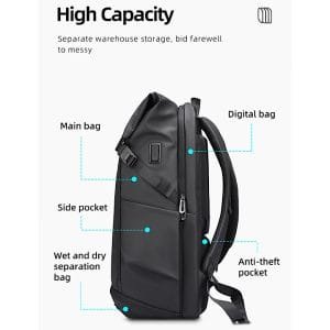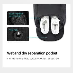Constructed from durable Oxford fabric, the backpack features a digital pocket designed to fit a 17-inch laptop and a 9.7-inch tablet, both protected by a cotton layer. The organization system includes a main compartment, side pocket, wet and dry separation bag, and an anti-theft pocket for secure storage of valuables.