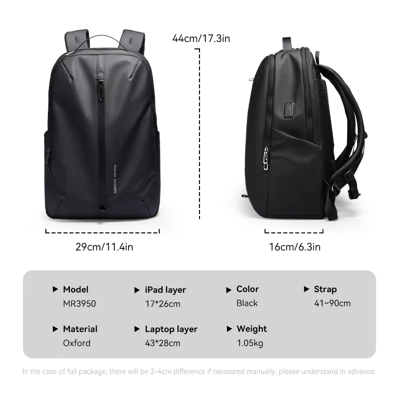 The Mark Ryden Model 2966 Backpack blends fashion and functionality with its high-capacity design and modern features. With a base capacity of 25 liters that expands to 36 liters, it provides ample space for daily essentials and travel gear. Measuring 47 x 30 x 18 cm and weighing 1.14 kg, the backpack combines a roomy interior with a lightweight build.