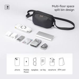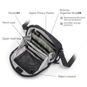 The bag’s multi-floor space includes a pencil case, a zipper privacy pocket, and stretchy organizer straps, allowing for well-organized storage of items such as phones, mobile power banks, eyeglasses, car keys, earphones, and ATM cards. The microfiber storage partitions and object lanyard add to the organizational efficiency.