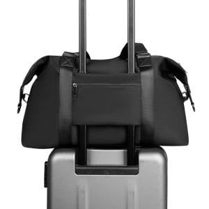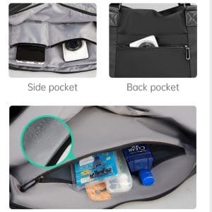 The bag includes multiple compartments, such as a spacious main pocket, a waterproof pocket, and additional side and back pockets for better organization. Its design incorporates a luggage strap for easy attachment to trolley cases, a comfortable handle for easy carrying, and a shoulder strap buckle for versatile carrying options.