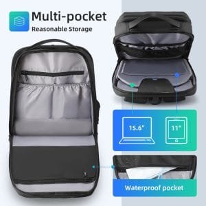 Measuring 44 x 30 x 14 cm, the backpack comfortably accommodates a 15.6″ laptop and an 11″ iPad in dedicated, protective layers. Its thoughtful design includes additional compartments for A4-sized textbooks, pens, wallets, tablets, and even a water bottle, allowing you to organize your items efficiently. The integrated USB port offers convenient charging for your devices on the move.