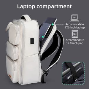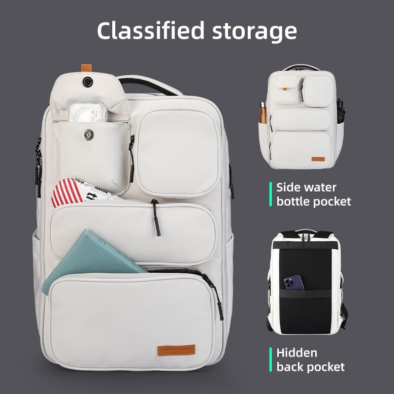 This backpack offers ample storage with its large internal volume, accommodating a 17.3-inch laptop and a 12.9-inch tablet. It features multiple pockets for organized storage, including a front sorting pocket, privacy zipper pocket, two small items bags, two stretchy mesh bags, and a side water bottle pocket for quick access to your kettle.