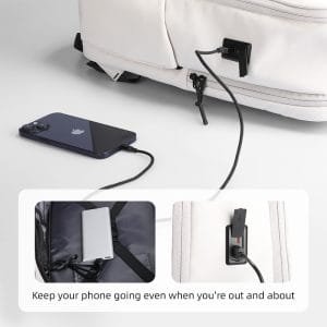 Additional conveniences include an external USB charging port, allowing you to keep your phone powered on the go, and a built-in keychain to ensure your keys are always within reach. The backpack’s waterproof fabric prevents your belongings from getting wet, while the YKK zippers provide durability and smooth operation.
