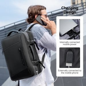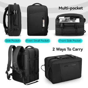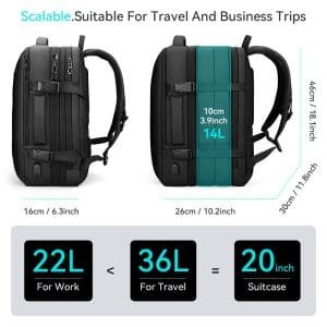 This backpack offers expandable storage that ranges from 22 liters, perfect for daily work needs, to 36 liters, making it ideal for travel. The interior is organized with multiple layers, including compartments for a 17.3-inch laptop, an 11-inch tablet, and other digital devices. The exterior includes various pockets, including a front pocket, a side pocket, and an anti-theft pocket for securing valuables.