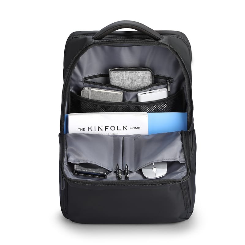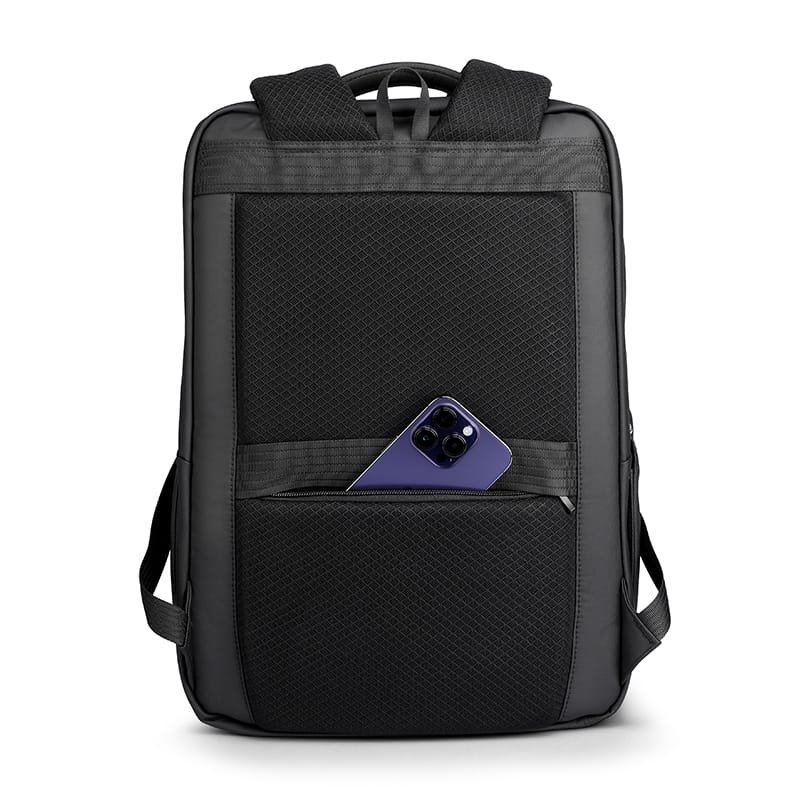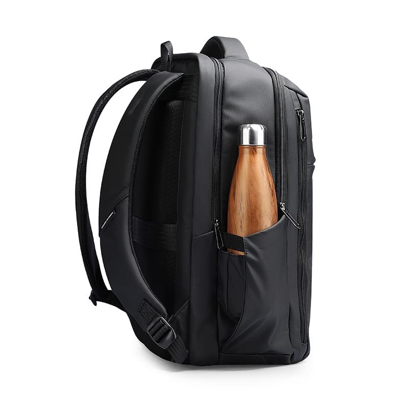 The backpack includes a dedicated laptop compartment that accommodates up to a 15.6-inch laptop and an additional pocket for an 11-inch pad. It also boasts multiple pockets for organization: two side bottle pockets, front and back pockets, and two side pockets for added convenience.