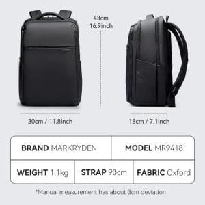 The Mark Ryden 9418 backpack combines practicality and style with high-density Oxford spun fabric, which is both splash-proof and durable. Weighing just 1.1kg and measuring 43x30x18 cm, this backpack is designed for efficiency and ease of use. It features a high-quality YKK zipper for smooth operation and long-lasting performance.