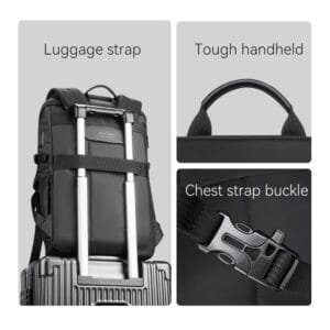 The backpack is equipped with a hidden USB charging port, a secure anti-theft back pocket, and an X-shaped textured buckle for added flair. Breathable materials and a luggage strap ensure comfort and convenience whether you’re commuting across town or flying to your next destination.